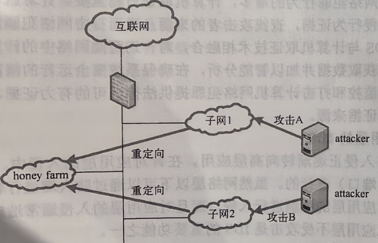 蜜场的工作原理比较简单:将所有的蜜罐都集中部署在一个独立的网络中,这个网络成为蜜场的中心;在每个需要进行监控的子网中布置一个重定向器(redirector),重定向器以软件形式存在,它监听对未用地址或端口的非法访问,但它们不直接响应,而是把这些非法访问通过某种保密的方式重定向到被严密监控的蜜场中心;蜜场中心选择某台蜜罐对攻击信息进行响应,然后把响应传回到具有非法访问的子网中去,并且利用一些手段对攻击信息进行收集和分析。
