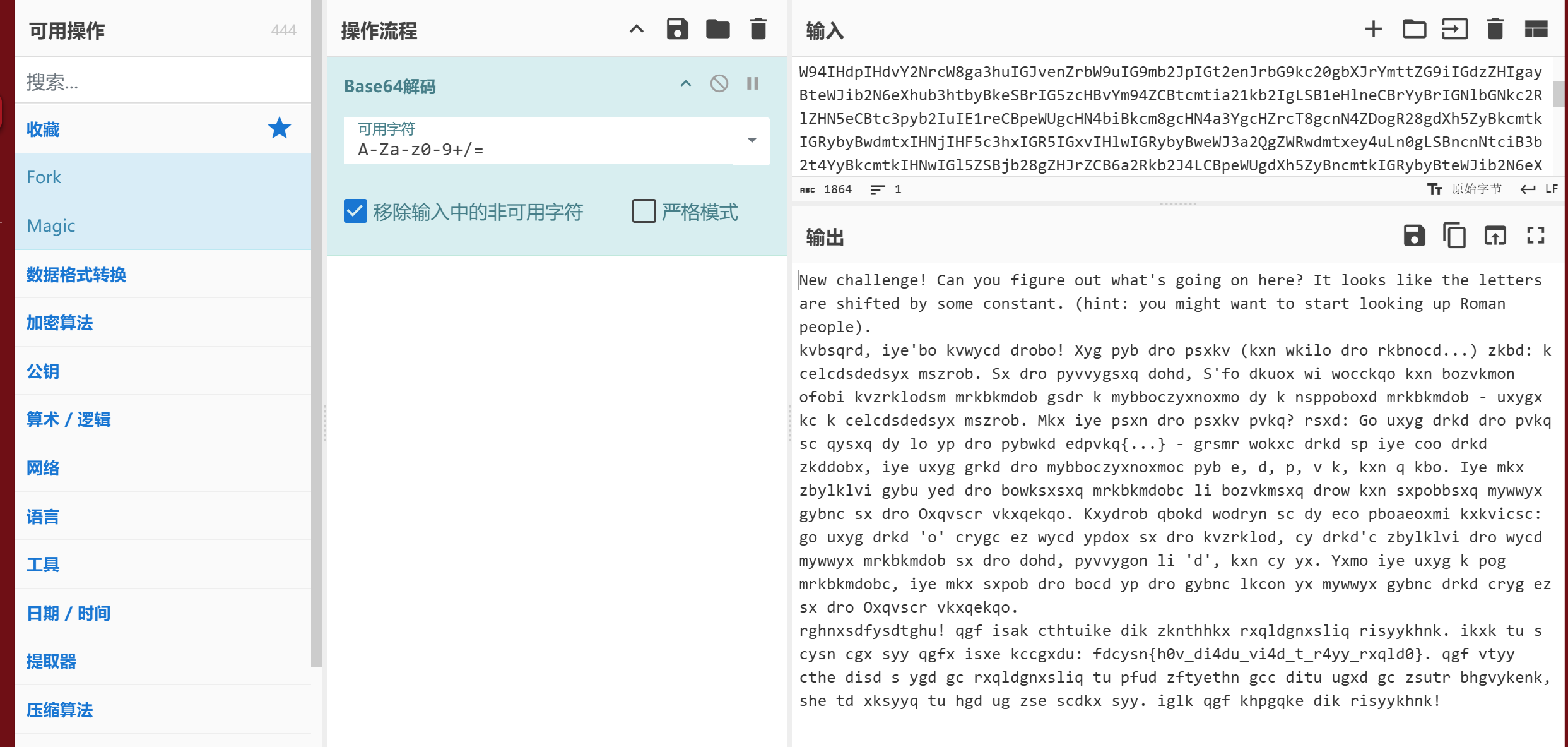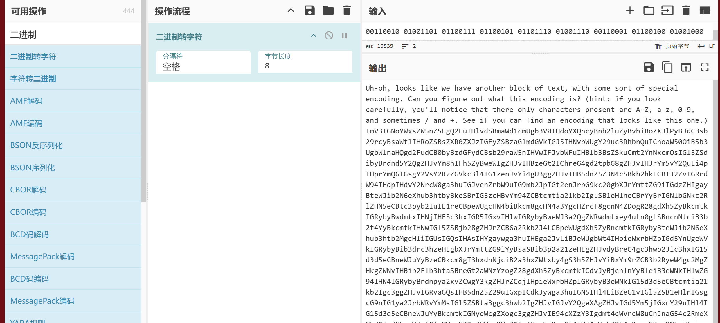 - smn.txt开头有等号猜测和base64编码相关:Base64 编码时需要将二进制数据按 3 个字节(24 位)为一组,转换成 4 个 6 位的 Base64 字符,所以有时会在结尾填充=。