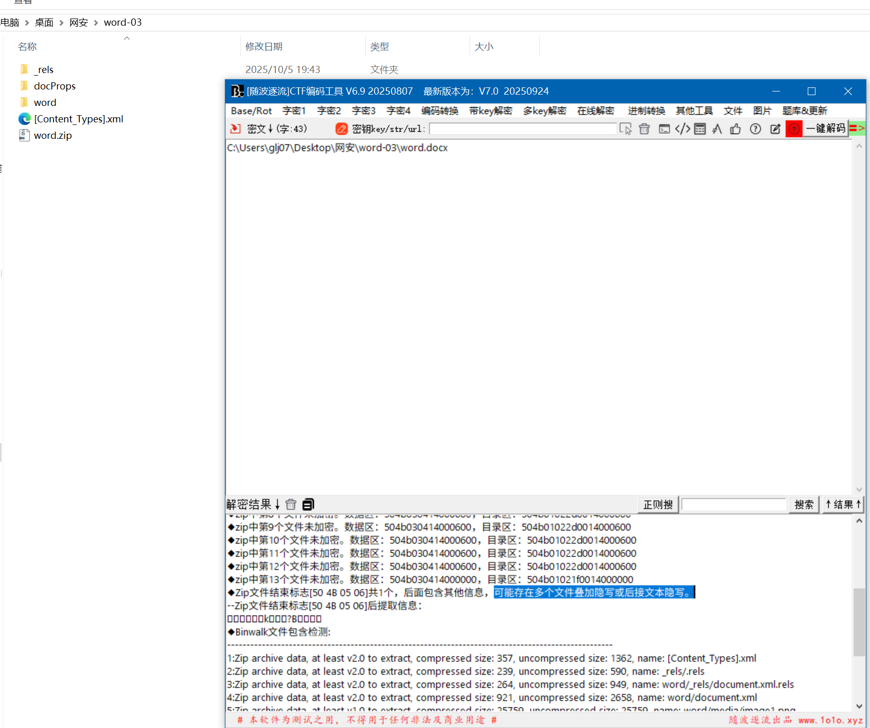 - 用foremost提取得到压缩包(Foremost 是一款常用于文件提取和数据恢复的工具,尤其在Misc(杂项)、Forensics(取证)和Steganography(隐写术)类题目中经常使用。它的核心功能是从磁盘镜像、二进制文件或存储设备中提取隐藏或删除的文件,基于文件的头部(Header)和尾部(Footer)签名进行识别。)