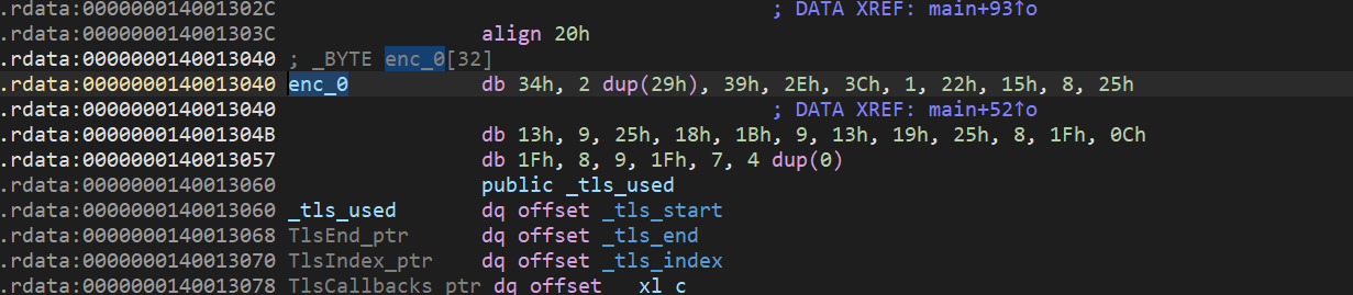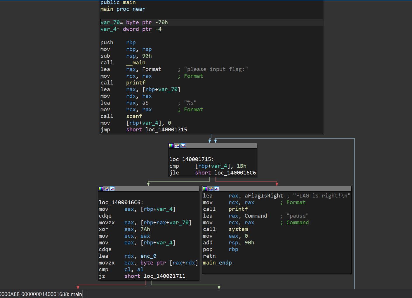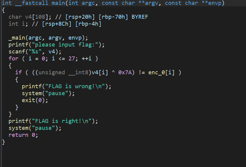 所以只要在 IDA 里找到 enc_0 数组的内容(应该是 28 个字节),然后每个字节与 0x7A 异或,就能得到 flag。